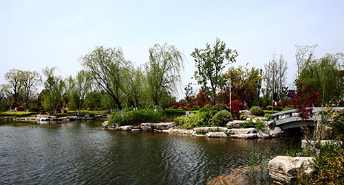 其中,人工湖面積7000平方米,小而精致,可謂是整個公園的“點睛之筆”。由親水平臺區(qū),源頭區(qū),中心湖面區(qū),鄰水生態(tài)區(qū),橋梁區(qū)構(gòu)成。湖面區(qū)域貫穿整個工程,沒有自然條件的襯托,完全由人工園林造景手法完成,在鄰水景觀帶種植睡蓮、荷花、再力花、千屈菜、鳶尾、蘆葦?shù)人参?,營造生態(tài)岸線,同時選擇其他親水植物,如美人蕉、碧桃、楊柳、水杉作為過渡和背景,虛實結(jié)合,營造出多方位的景觀效果。湖面雖小,但結(jié)構(gòu)完整,假山疊水,拱橋,原石臨水橋,湖邊卵石生態(tài)群落一應(yīng)俱全。其中,景石主要使用了安徽的靈璧景石,約7000噸,堆疊出水源、暗橋、親水沿岸等景觀。