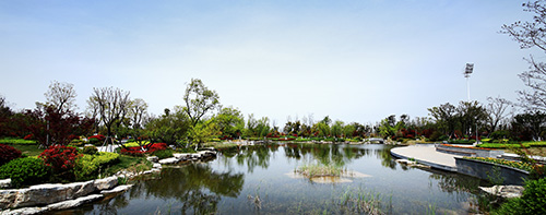 據(jù)夏修智介紹,奧體公園是工程的主要景觀節(jié)點,位于奧體中心西北側(cè),面積約5萬平方米,是一座集娛樂、運動為一體的特色濱水運動公園,也是整個奧體中心的“綠肺”。一條蜿蜒的河流將公園劃分為東部運動區(qū)和西部休閑公園區(qū)。運動區(qū)緊挨訓(xùn)練中心,東側(cè)便是足球場、籃球場和排球場,運動后就能感受到融入大自然的清新;休閑公園區(qū)包括入口廣場、樹陣廣場、以及河水匯聚而成的小人工湖,湖邊蘆葦迎風(fēng)擺動,湖水清澈見底,鵝卵石鋪就的湖底清晰可見。整個奧體公園以中國古典園林為主、回歸自然的組團式造景手法,強調(diào)休閑、幽靜、生態(tài)自然。從西入口廣場的草坡,逐漸過渡到觀賞性強的觀花、觀葉園林樹種,配合灌木、草木、地被形成人為景觀,從西到東植物次第減少,層次不斷變化,形成了從自然生態(tài)狀綠化到人工幾何狀綠化的逐漸過渡,讓自然的活力與體育精神融為一體。