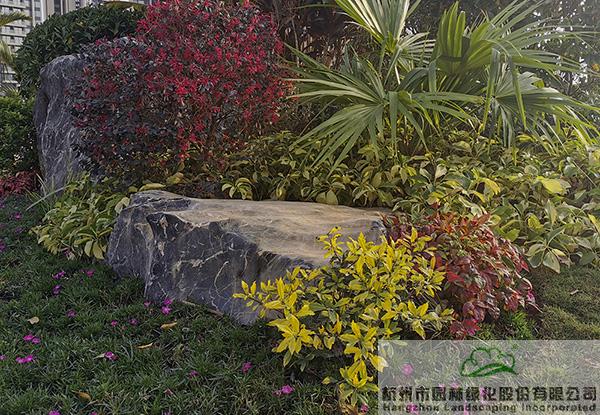 項目中應(yīng)用了許多景石,為了避免出現(xiàn)視覺的疲憊,每塊景石的形態(tài)、大小、植物配置都各有千秋。在一些入口和節(jié)點處,通過景石與色葉植物、開花植物、球類植物的有機搭配,營造出一個個意趣盎然的花境景觀。